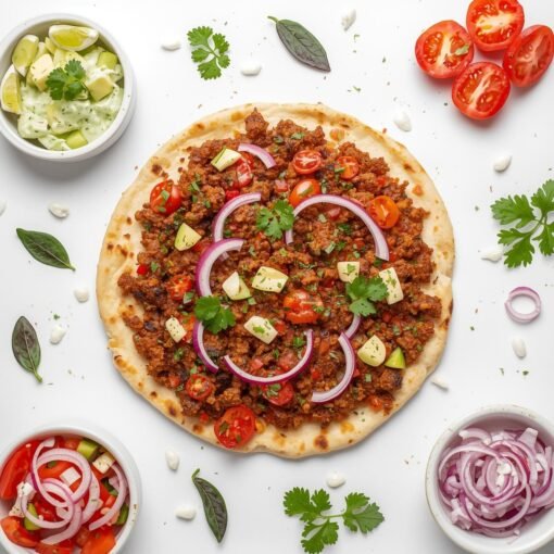 Lahmacun mit Putenfleisch ist ein dünner Teigfladen, belegt mit zartem Putenfleisch, frischem Gemüse und würziger Sauce. Die Kombination aus herzhaftem Fleisch und frischen Beilagen macht dieses Gericht zu einem leckeren und sättigenden Snack oder einer schnellen Mahlzeit.