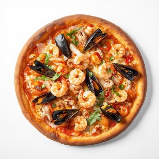 Die Pizza Frutti Di Mare ist eine aromatische Meeresfrüchte-Variante auf knusprigem Pizzaboden. Belegt mit fruchtiger Tomatensoße, reichlich Käse, Knoblauch und einer Auswahl an frischen Meeresfrüchten entsteht eine herzhafte und geschmackvolle Mahlzeit – ideal für alle, die Fisch und Meeresfrüchte lieben.