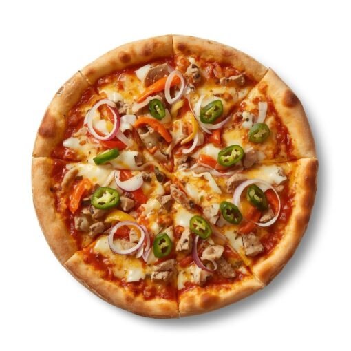 Die Pizza Gabriel ist eine herzhafte Variante auf knusprigem Pizzaboden. Belegt mit fruchtiger Tomatensoße, reichlich Käse, saftigem Putenfleisch, Zwiebeln, Paprika und Knoblauch entsteht eine aromatische und sättigende Mahlzeit – ideal für alle, die würzige und fleischhaltige Beläge lieben.