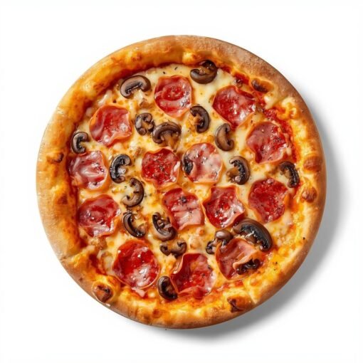 Die Pizza Salami-Vorderschinken-Champignons mit Käse ist eine herzhafte Kombination aus würziger Salami, mildem Vorderschinken und frischen Champignons auf einem knusprigen Pizzaboden. Belegt mit fruchtiger Tomatensoße und reichlich Käse entsteht eine aromatische, sättigende Mahlzeit – perfekt für alle, die mehrere klassische Beläge in einem genießen möchten.
