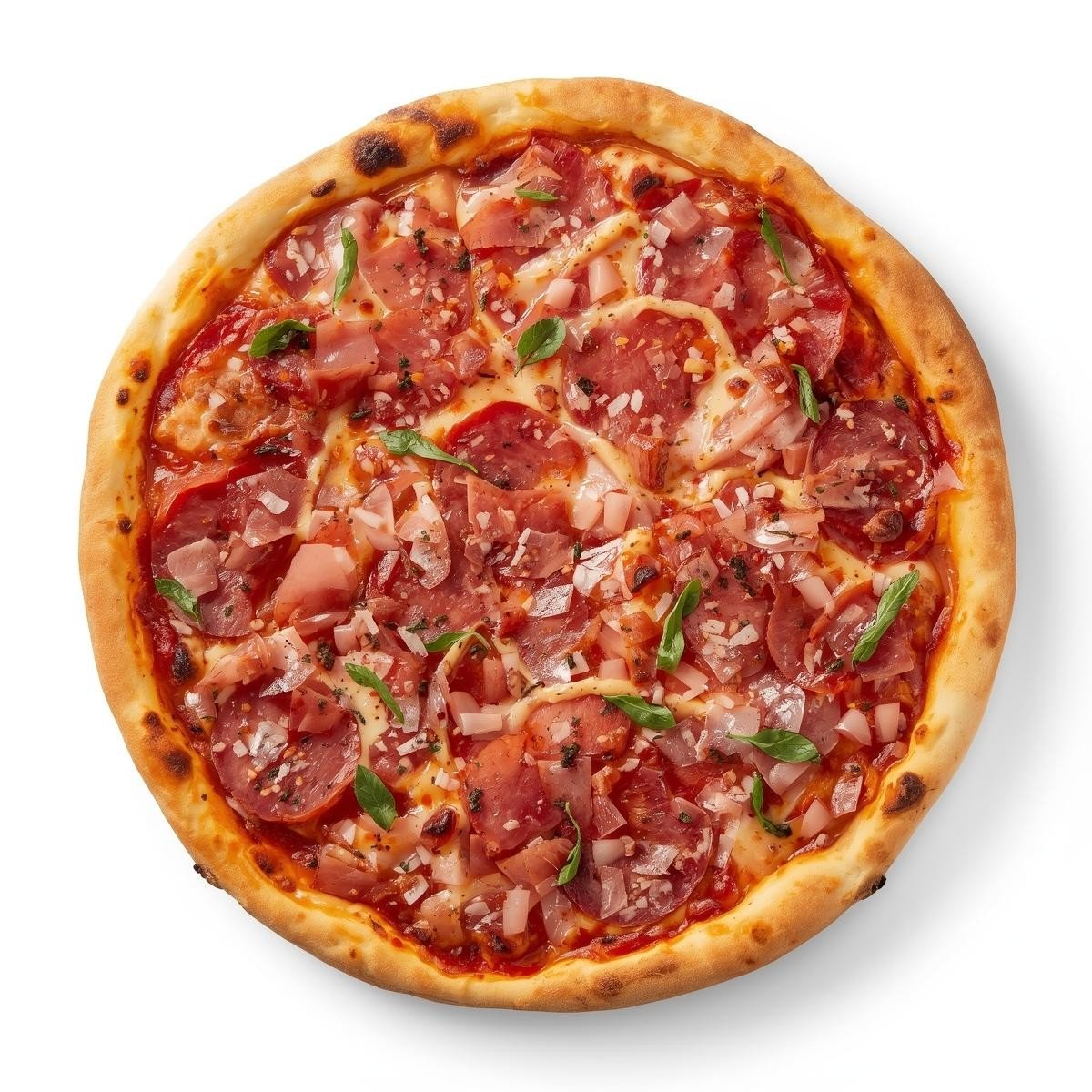 Die Pizza Salami Vorderschinken kombiniert zwei beliebte Klassiker auf einem knusprigen Pizzaboden. Belegt mit fruchtiger Tomatensoße, reichlich Käse, würziger Salami und mildem Vorderschinken entsteht eine herzhafte und sättigende Geschmackskombination, die bei Groß und Klein gut ankommt.